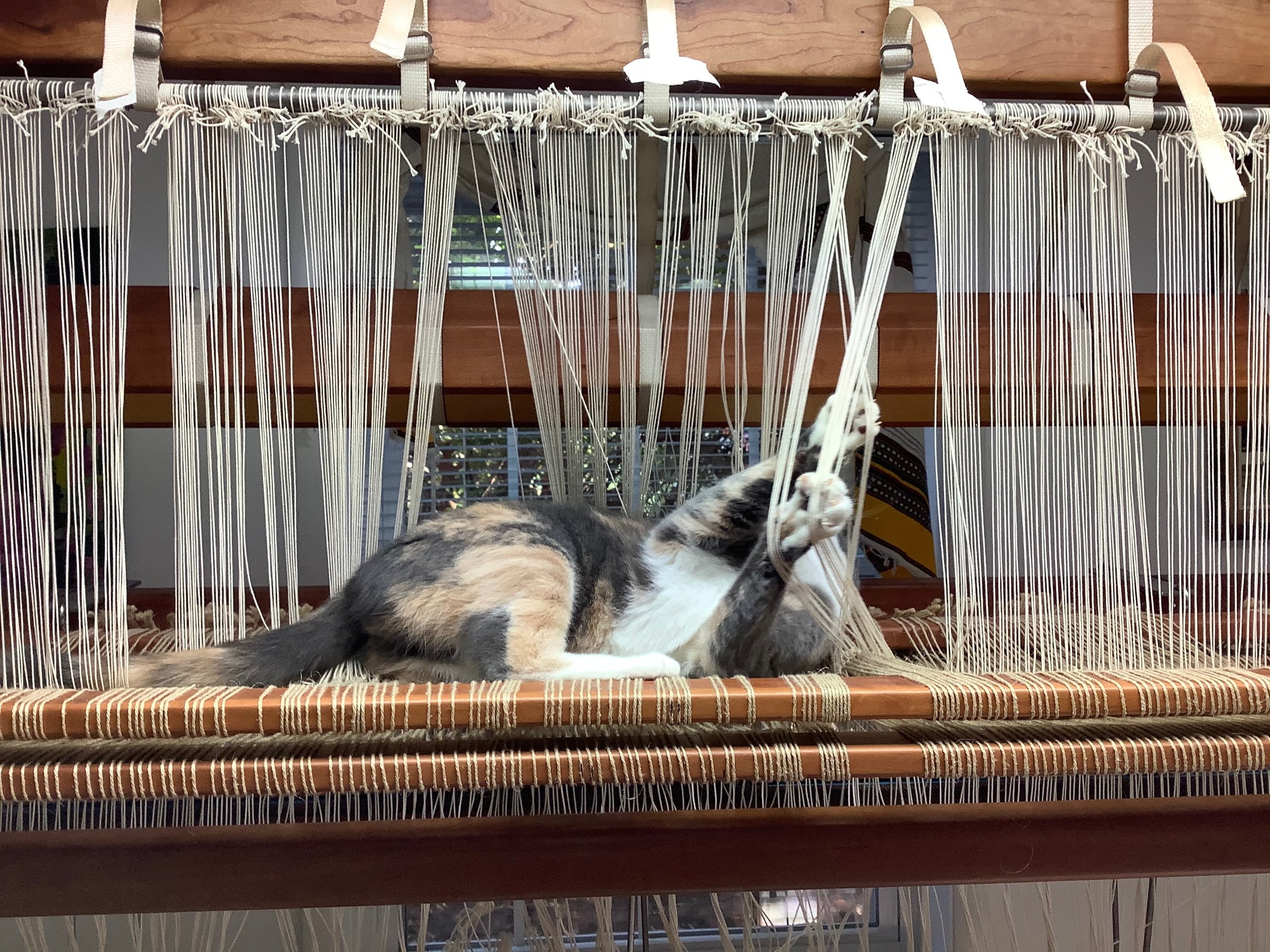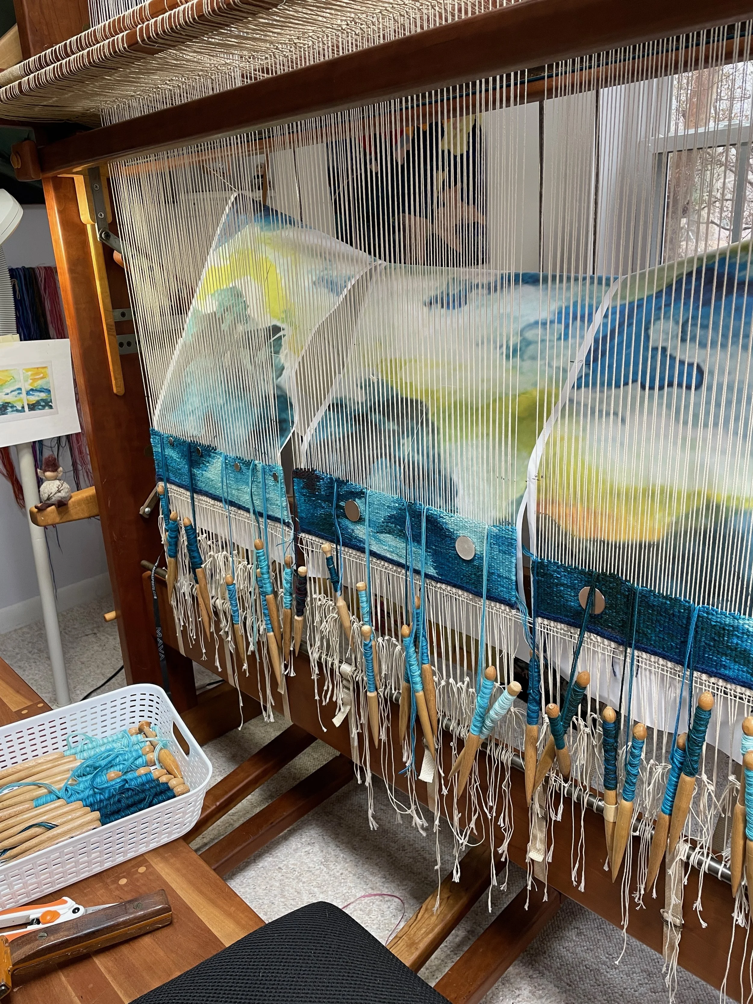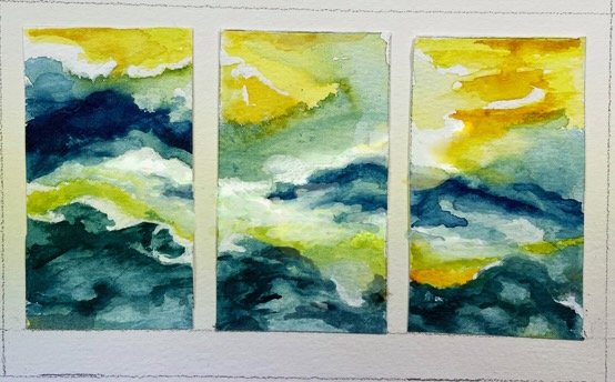 This tapestry is based on a watercolor that I painted. It is a triptych with each section 16” wide by approximately 34” high. It is based on a visit to the mountains when the mist was working it way in and out of the mountains with the sun trying to shine it way through. It will probably take several months to weave. Below is the watercolor for the design.